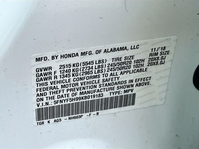 White Diamond Pearl 2019 Honda Pilot Touring 8 Passenger FWD 9-Speed Automatic 3.5L V6 24V SOHC i-VTEC Apple CarPlay/Android Auto, Blind Spot Information (BSI) System warning, Exterior Parking Camera Rear, Front fog lights, Lane departure: Lane Keeping Assist System (LKAS) active, Memory seat, Navigation system: Honda Satellite-Linked Navigation System, Power driver seat, Power Liftgate, Power moonroof, Rear air conditioning, Remote keyless entry, Wheels: 20'' Machine-Finished Alloy.